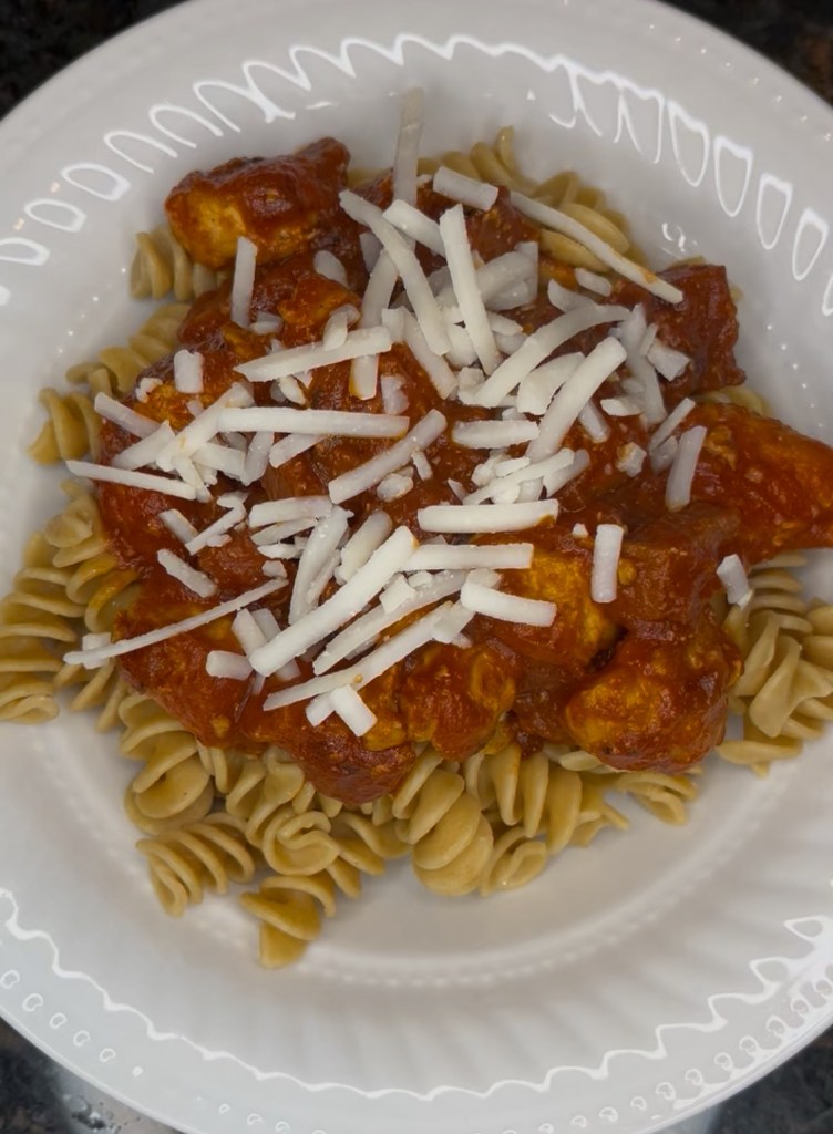 - Otherwise, add the tomato sauce into the pan with your chicken chorizo mix. Service over pasta and top with Moocho Mozzarella.