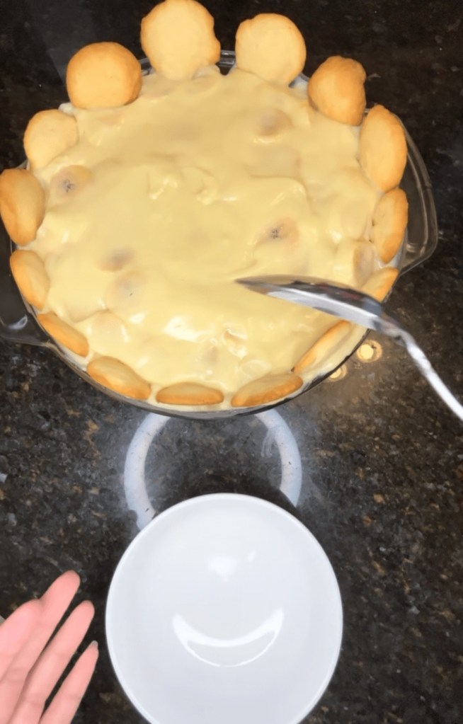 5. Repeat until dish is full or you run out of ingredients. I like to save some vanilla wafers to decorate the dish neatly before serving.